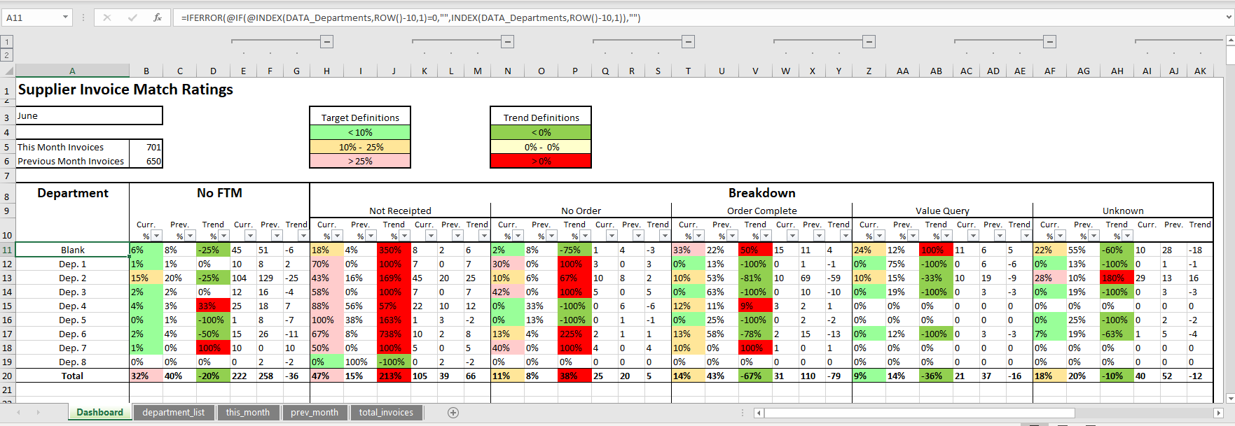 Business Requirement: To create a dashboard to identify why supplier invoices are not automatically matching to their purchase orders. This is to be categorised by department, so we can see what departments are not completing their purchase orders (within the ERP system) to the required standard.